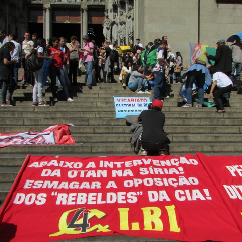 „Nieder mit der NATO-Intervention in Syrien! Zerbrecht die Opposition der CIA-„Rebellen“. Spruchband auf den Stufen der Kathedrale der drittgrößten katholischen Diözese der Erde.