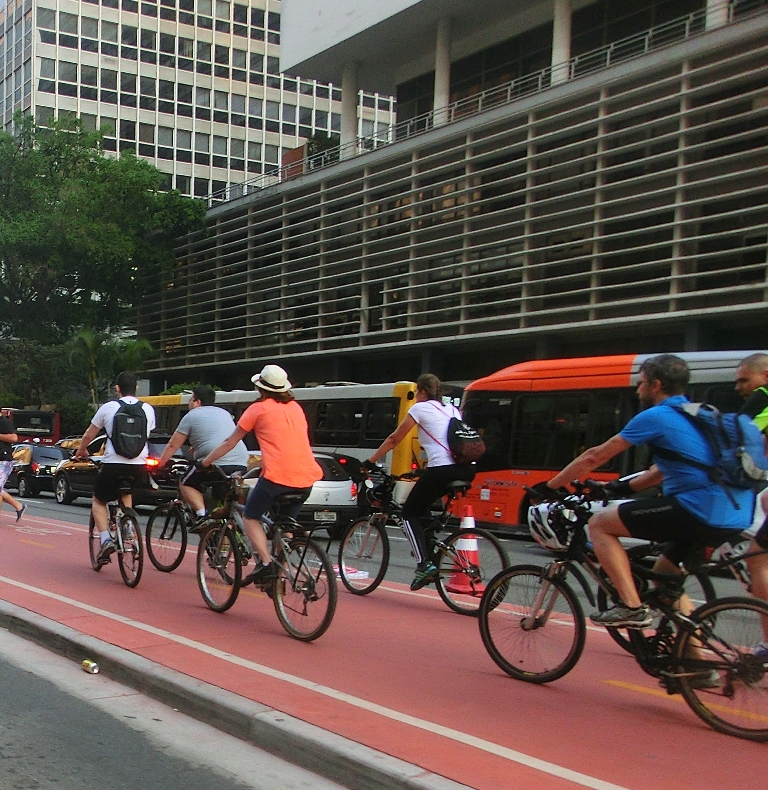Noch vor etwa zehn, zwölf Jahren wurde man als Ausländer in Sao Paulo in Läden, Restaurants von Einheimischen angesprochen: „Sind sie das, der hier in der City mit dem Fahrrad fährt?“ So gut wie niemandem kam in den Sinn, das Rad als Transportmittel einzusetzen und damit angesichts von Dauerstaus im Verkehrschaos nahezu durchweg schneller und flexibler als Motorfahrzeuge zu sein, geschickt Fußwege nutzen zu können. Dann wurden durch eine Wertsteigerung der Landeswährung Real Reisen in Länder wie Holland oder Deutschland für immer mehr Brasilianer erschwinglich, die dort die Fahrradkultur entdeckten und schätzen lernten. Nach der Rückkehr legten sich manche ein Rad zu, von Jahr zu Jahr immer mehr, auch die Zahl der Fahrradläden wuchs auffällig. Organisierter Radfahrerprotest, Radfahrerdemos zugunsten eines seit Jahrzehnten überfälligen Radwegenetzes schienen indessen zur Erfolglosigkeit verdammt – die Autofahrerlobby schmetterte entsprechende Forderungen problemlos ab. Daher kaum zu begreifen, warum unter Sao Paulos Bürgermeister Eduardo Haddad von der Arbeiterpartei PT nun auf einmal innerhalb von Monaten ein geradezu gigantisches Radwegenetz installiert wurde, das für all jene, die seit vielen Jahren das Abenteuer Fahrradfahren ausprobierten, sensationelle Verbesserungen, einen direkt grotesk hohen Gewinn an Lebensqualität mit sich bringt. Eine ganze Megacity steckt durch die neuen „Ciclovias“ in einem bemerkenswerten Lernprozeß, entsprechende Verhaltensänderungen sind allerorten zu beobachten. Laut Präfekturangaben besitzt Sao Paulo inzwischen 356,8 km Radwege, weit mehr sind geplant. Indessen wurden bisher vor allem Hauptverkehrsadern, wichtige Avenidas mit Ciclovias bedacht – auf kleineren Straßen fehlen sie bis auf weiteres meist nach wie vor.