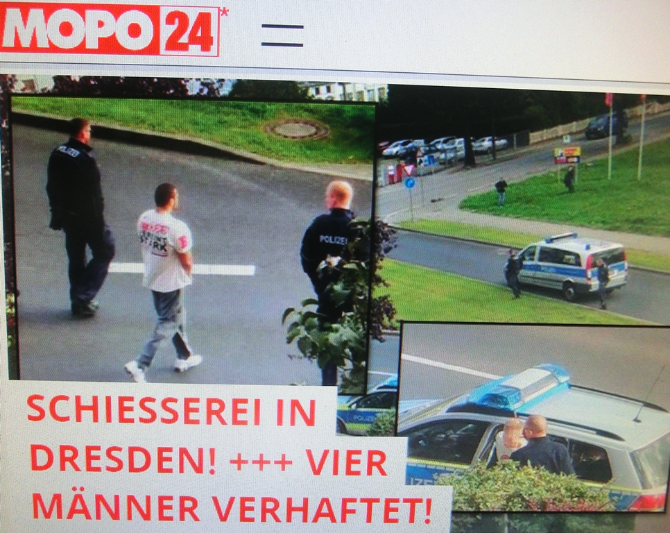 „Dresden – Bandenzoff, Unfall, Schüsse: Diese Szenen kennt man aus den USA, aber nicht mitten in Dresden. Am Mittwoch ist jedoch genau das im Stadtteil Prohlis passiert.“ Mopo zwei Tage nach der systemkritischen Pegida-Protestaktion just zu diesem und anderen Themen dieser Art.