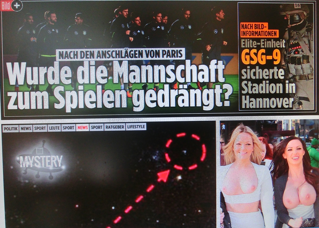 „Hannover – Das Länderspiel zwischen Deutschland und den Niederlanden findet am Dienstag wie geplant statt. Die Weltmeister setzen damit gemeinsam mit Kanzlerin Angela Merkel und allen Ministern ein Zeichen gegen den Terror.“ Der Standard, Österreich