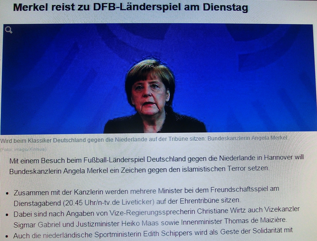 13.07 Uhr:Mit einem Besuch beim Länderspiel Deutschland gegen die Niederlande in Hannover will BundeskanzlerinAngela Merkel(CDU) ein Zeichen gegen den islamistischen Terror setzen. Focus, gleichlautend DIE WELT