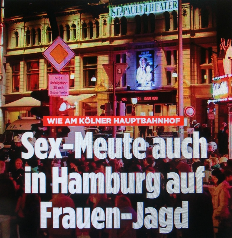 « Kölner Multikulti-Horror natürlich auch in Hamburg, Stuttgart, Frankfurt, Berlin, Düsseldorf, Bielefeld, wie von Pegida-Legida seit vielen Monaten vorausgesagt – gesteuerter Mainstream berichtet erwartungsgemäß erst mit großer Verspätung: „Sex-Meute auf Frauen-Jagd. Junge Mädchen bepöbelt, begrapscht und ausgeraubt“. Bildzeitung, Jan. 2016. Neoliberale Frauenpolitik unter Merkel-Gabriel/SPDCDU… „Die Männer griffen ihnen an die Brüste, in den Intimbereich.“ Aus welchen westdeutschen Städten wird derartiges noch verheimlicht? Merkel, Gauck, Gabriel schweigen weiter…Was die Islamisierungsparteien unter Kulturbereicherung verstehen – bereits erreichte Resultate weisen auf politische Ziele, darunter bei Frauenrechten. – „SEX-MOB BEGRABSCHT FRAUEN IN KÖLN UND HAMBURG | Verdächtige lachen Polizei aus“. Bildzeitung 2016 über die neue Frauenpolitik der SPDCDU-Regierung. Politisch verantwortliche Kölner OB Reker immer noch im Amt…Horror von Köln, Hamburg, Stuttgart weist auf tatsächliche Wertvorstellungen deutscher Politschauspieler. Vor dem Hintergrund der jüngsten Ereignisse wird deutlicher, warum systemkritische Oppositionsbewegungen wie Pegida-Legida von interessierter Seite kriminalisiert werden. Köln-Hamburg-Horror, die fremdenfeindlichen rassistischen Übergriffe gegen deutsche Frauen auf einmal Topthema bei ARD-Tagesschau – wieso erst am 5. Januar und nicht bereits am 1. Januar 2016? »