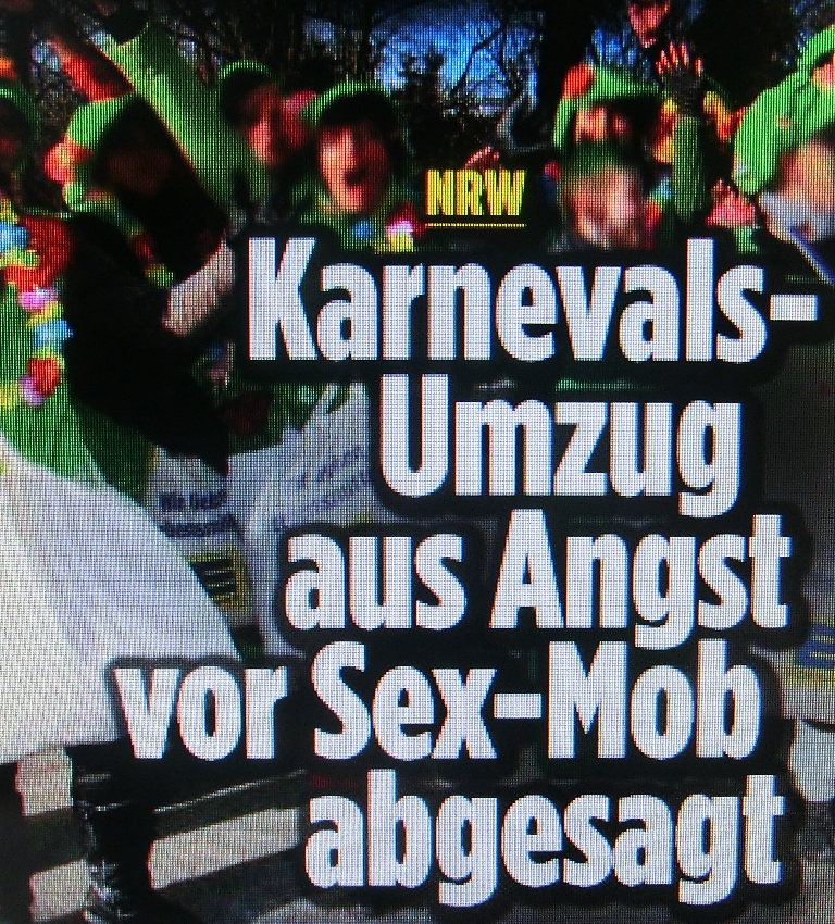 Ausriß Bild – islamistische Frauenpolitik und „Kulturbereicherung“ unter der Merkel-Gabriel-Regierung:“Karnevalsumzug aus Angst vor Sex-Mob abgesagt.“ Politisch verantwortliche NRW-Autoritäten weiter im Amt, unbestraft…