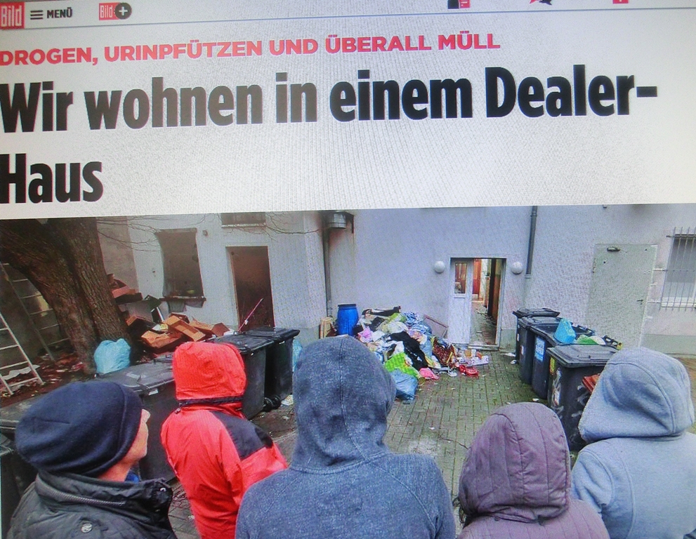 „Der Uringestank im Flur ist unerträglich, Bierflaschen liegen in den dort geparkten Kinderwagen. Die Briefkästen sind demoliert, Fensterläden und Treppengeländer auch, im Hof türmt sich der Müll. Und im Haus-Eingang wird mit Drogen gehandelt. Täglich.“ Zitat Bild