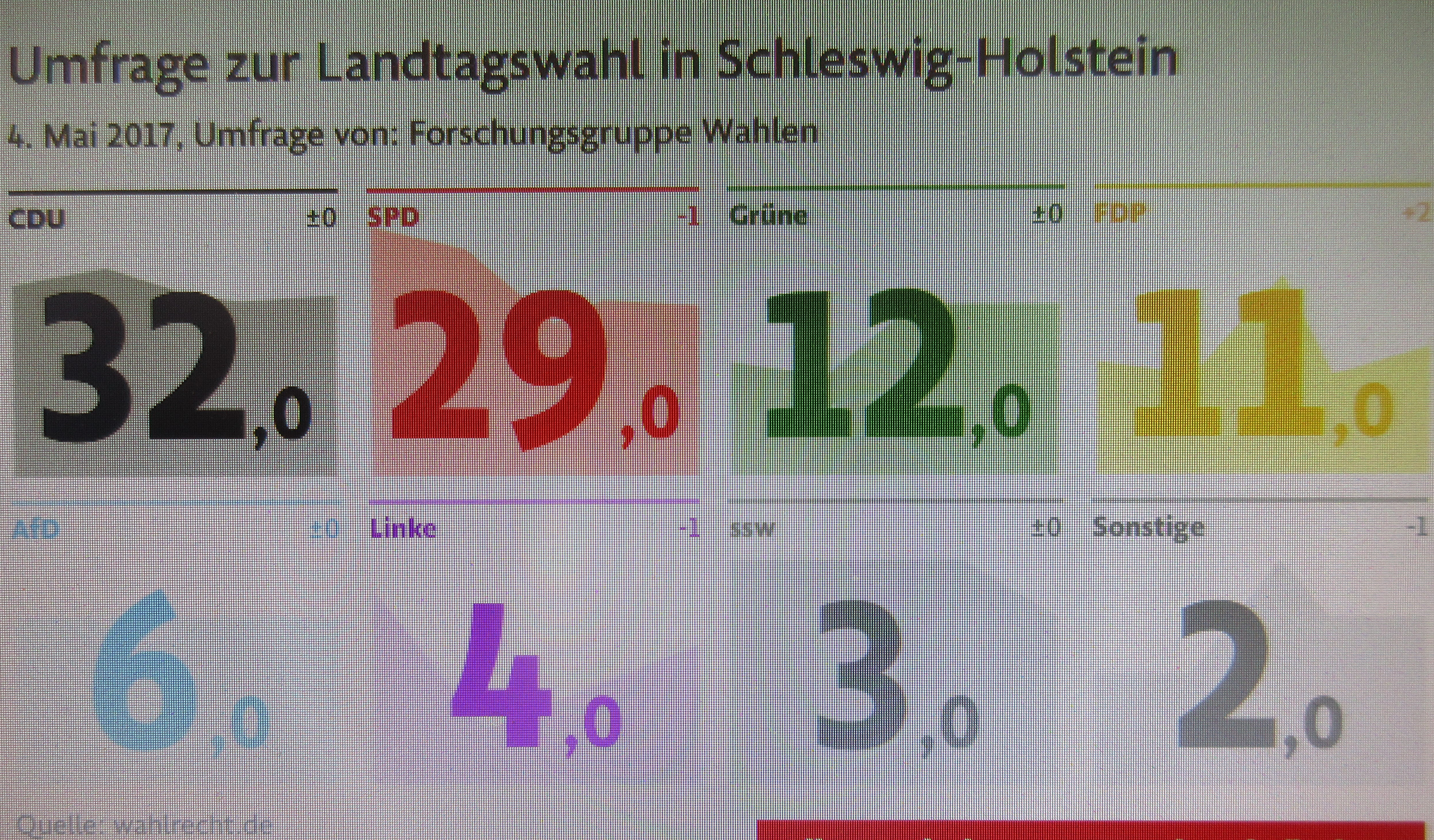 « „Das derzeit einzige realistische Bündnis wäre laut der am Donnerstag veröffentlichten Umfrage eine große Koalition aus SPD und CDU.“ NRW-Landtagswahlen 2017, news.de zu Schwester-und Kartell-Parteien CDU und SPD. Wahlen in Schleswig-Holstein 2017. „100% des in Schleswig-Holstein verbrauchten Stroms gewinnen wir aus erneuerbarer Energie.“ GRÜNE-SH, Wahrheit oder Fake News? – Schleswig-Holstein-Wahlen 2017, Resultate: SPD-Schwesterpartei CDU vorn(32 %) – AfD drin – rd. 5,9 %, 5 Sitze, trotz gigantischer Behinderungen des AfD-Wahlkampfs durch politische Konkurrenten und gleichgeschaltete Medien(SPD 27,2 %, GRÜNE 12,9%, FDP 11,5%) . Im benachbarten Mecklenburg-Vorpommern ist die AfD zweitstärkste Partei, hat mit 20,8 % im Landtag 18 Sitze(SPD: 30,6 %, Schwesterpartei CDU: 19%, Grüne rausgeflogen). Braune BRD – Beispiel Schleswig-Holstein…“Merkel-Schulz-Scheinwahlkampf des Establishments”. AfD »