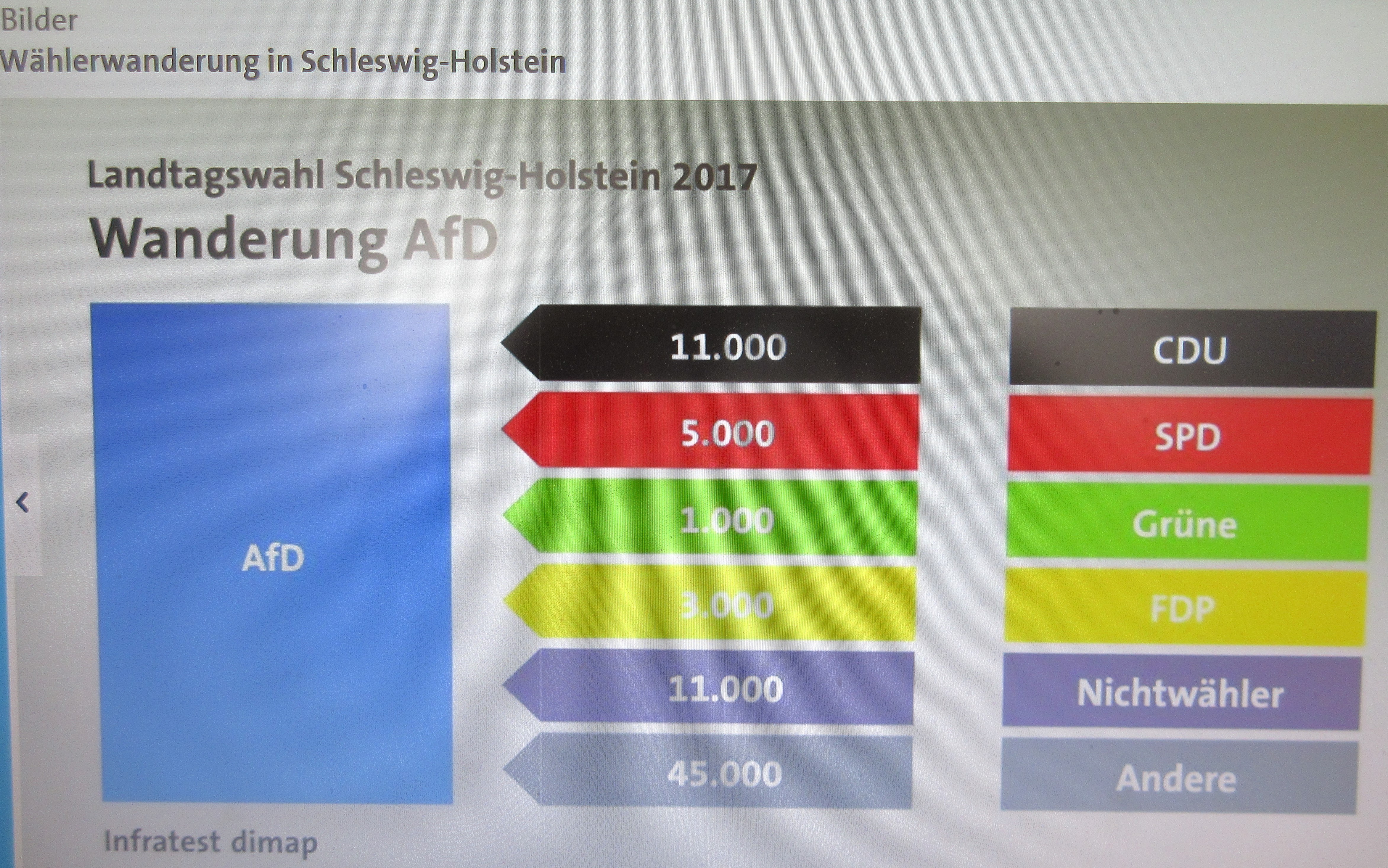 AfD und Wahlen in Schleswig-Holstein 2017, Wählerwanderung:”…die AfD, die erstmals in den Landtag einzieht, überrascht mit hohen Werten bei den 25-bis-34-Jährigen…” DER SPIEGEL zu SH-Wahlresultaten, Mai 2017. Hochpolitisierte, überdurchschnittlich informierte Andersdenkende und Systemkritiker – und die Wahlen 2017 in Deutschland. Wählerwanderung von Schwesterparteien CDU und SPD zur AfD…Gesteuerte Medien im Wahlkampf – und wachsendes Wählerinteresse an unterschlagenen Infos, historischen Fakten über deutsche Islamisierungs-und Kartellparteien…