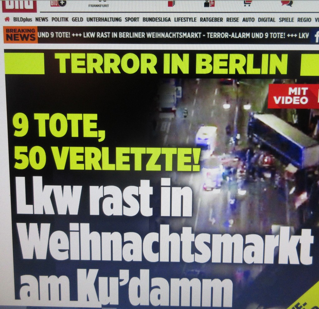 Ausriß BILD 2016. “Dass Weihnachtsmärkte von Polizisten mit Maschinenpistolen und Betonbarrikaden abgesichert werden – das geht nicht.” Westdeutsche Thüringer Allgemeine(Funke-Medienkonzern Essen im Sexmob-Bundesland NRW). Das geht doch – auch Mainstreamblätter machen unentwegt Propaganda für die politisch Verantwortlichen dieser Politikziele…