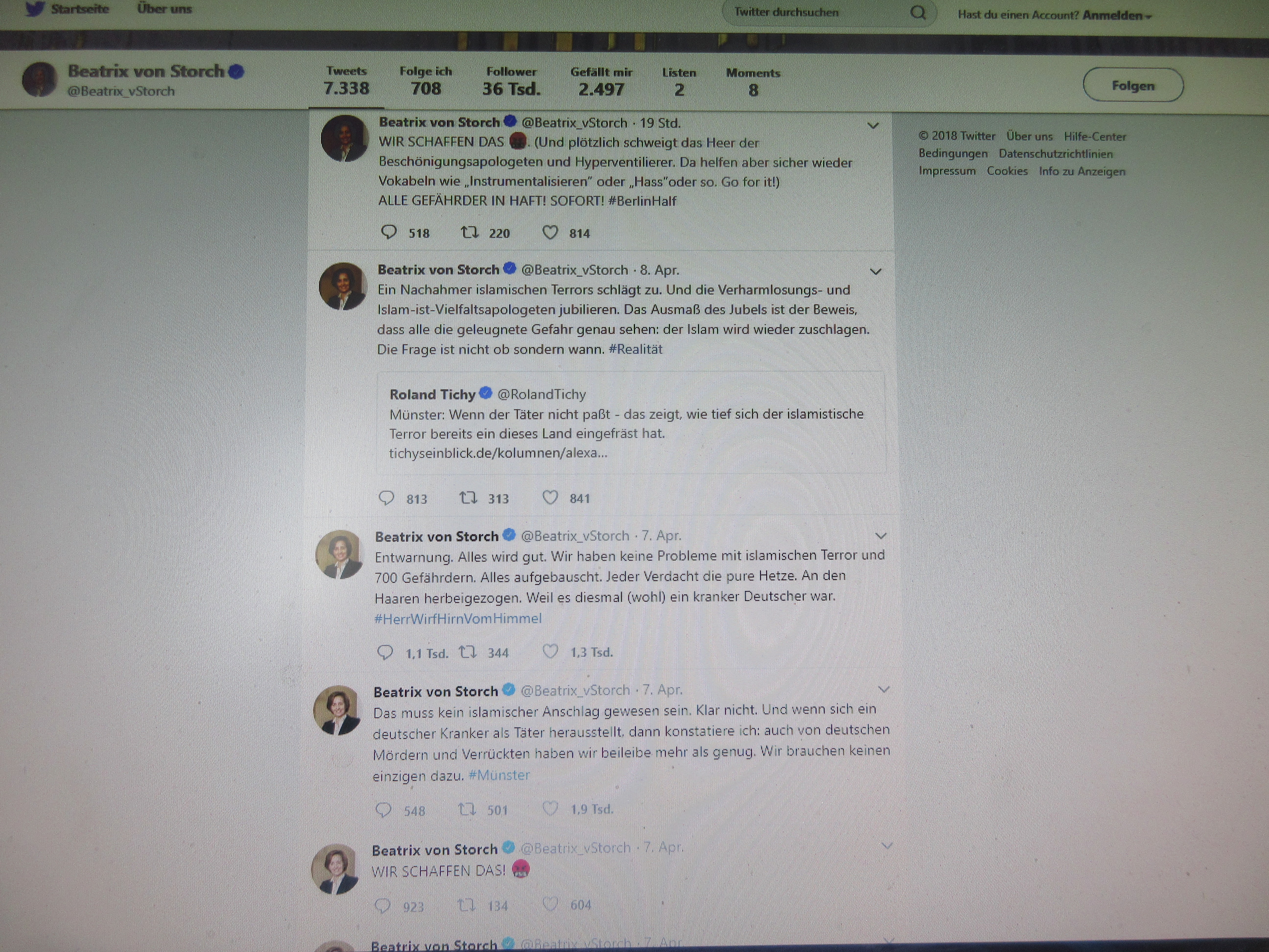 DER SPIEGEL:“Storch hatte unmittelbar nach den ersten Meldungen über die Amokfahrt den Satz `Wir schaffen das` von Bundeskanzlerin Angela Merkel (CDU) zum Flüchtlingszuzug zitiert und damit nahegelegt, ein Geflüchteter sei für die Tat verantwortlich.“