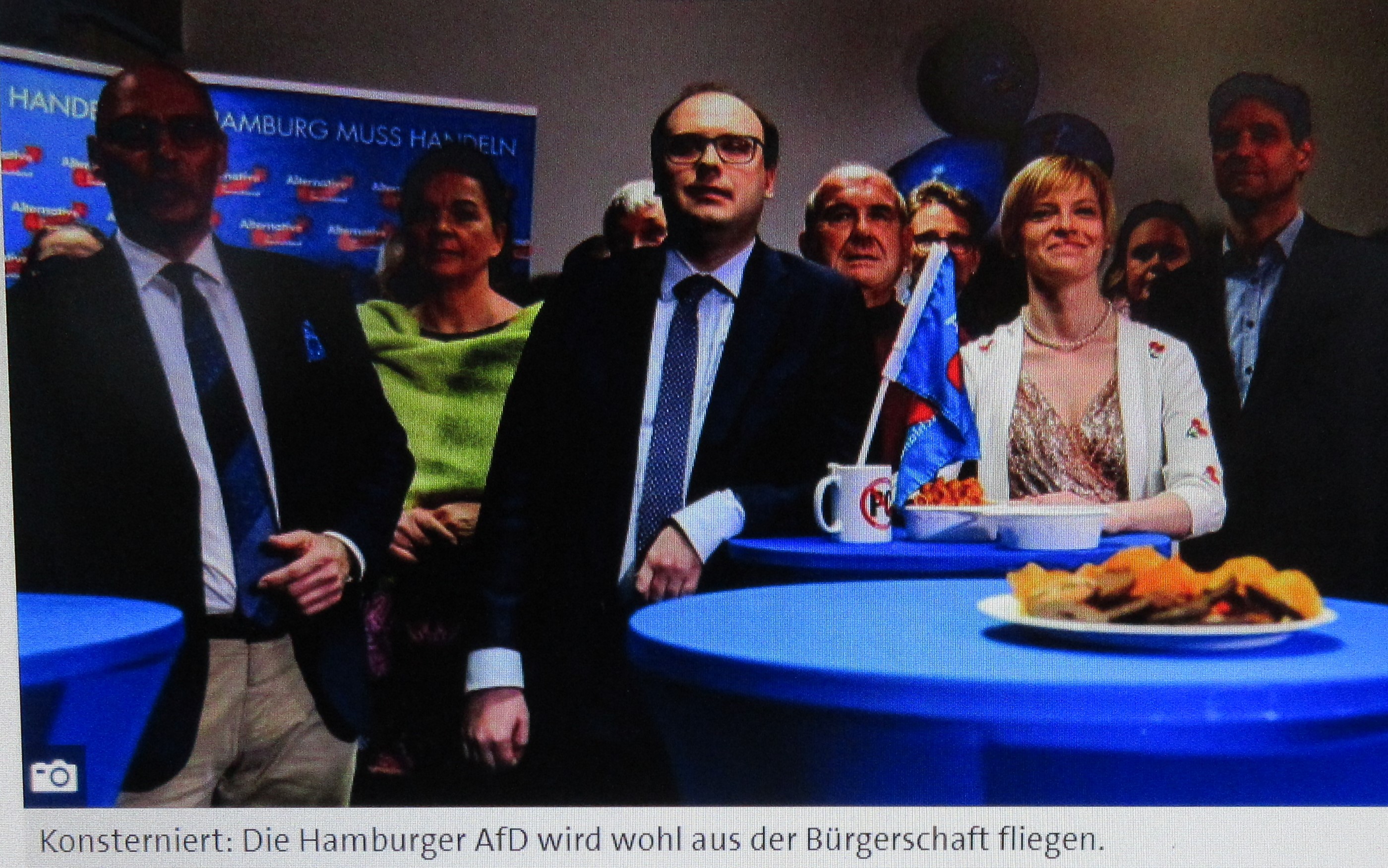 „Konsterniert: Die Hamburger AfD wird wohl aus der Bürgerschaft fliegen“. Tagesschau, produziert in der Relotius-Stadt Hamburg. Ausriß. (Die zweite von rechts wirkt aus Tagesschau-Sicht offenbar besonders konsterniert)