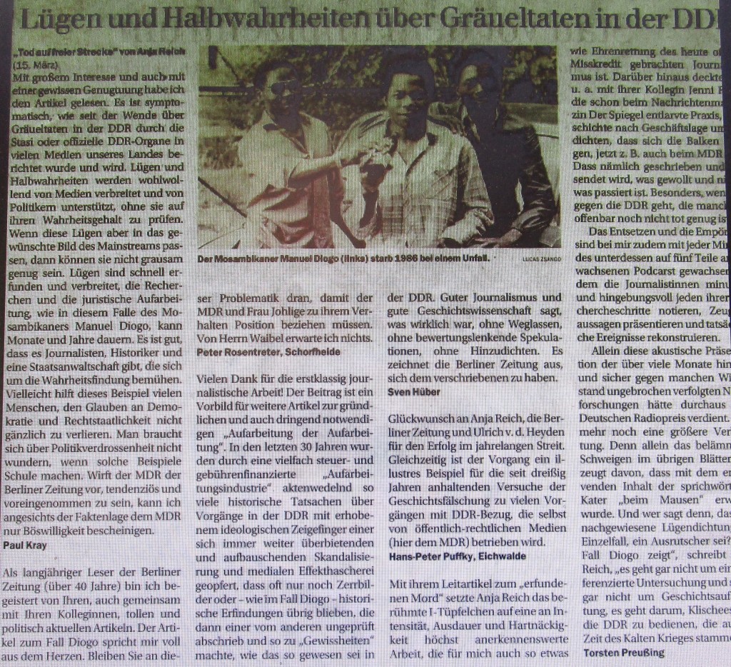 Die TV-Dokumentation weist auch ansonsten eine Reihe von Manipulationen auf, die den Zuschauer fragen lassen, wofür seine Steuergelder ausgegeben werden. So kommt ausgerechnet der Pressechef der RENAMO, Antonio Muchanga, also ein führendes Mitglied der Partei, die Millionen Menschen in Mosambik grausam ermordet, vertrieben oder mit heute kaum vorstellbaren Grausamkeiten drangsaliert hat und vor der viele der jungen Mosambikaner geflohen sind und in der DDR aufgenommen worden waren, in dem Film zu Wort und fordert »als Landsmann der zu Tode Gekommenen« im Namen der Familien und Hinterbliebenen eine lückenlose Aufklärung der Todesfälle der zwei Mosambikaner in der DDR. Scheinheiliger – und die wirklichen Verbrechen jener Zeit verharmlosender – geht es nicht!