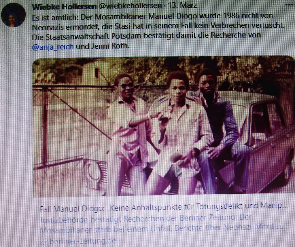 ARD-Doku von 2017, “Schatten auf der Völkerfreundschaft”, rund eine Dreiviertelstunde lang. Darin heißt es:”…Julio Goncalo Braga war ab 1984 fünf Jahre lang mosambikanischer Botschafter in Ostberlin. Und er bestätigt uns: Manuel Diogo wurde ermordet. `Die zuständigen Regierungsoffiziellen der DDR informierten uns über den Sachverhalt und entschuldigten sich bei uns, daß soetwas passiert wäre. Soetwas sei nicht normal`…Der Botschafter wurde informiert, bei den Tätern habe es sich um Neonazis gehandelt. Für ihn damals nichts Neues…Neonazis töten brutal einen mosambikanischen Staatsbürger. Es kommt zum Prozeß. Die Strafen fallen lächerlich gering aus. `Ja nao me lembro…Ich glaube, einige wurden für zwei bis fünf Jahre verurteilt.`…”