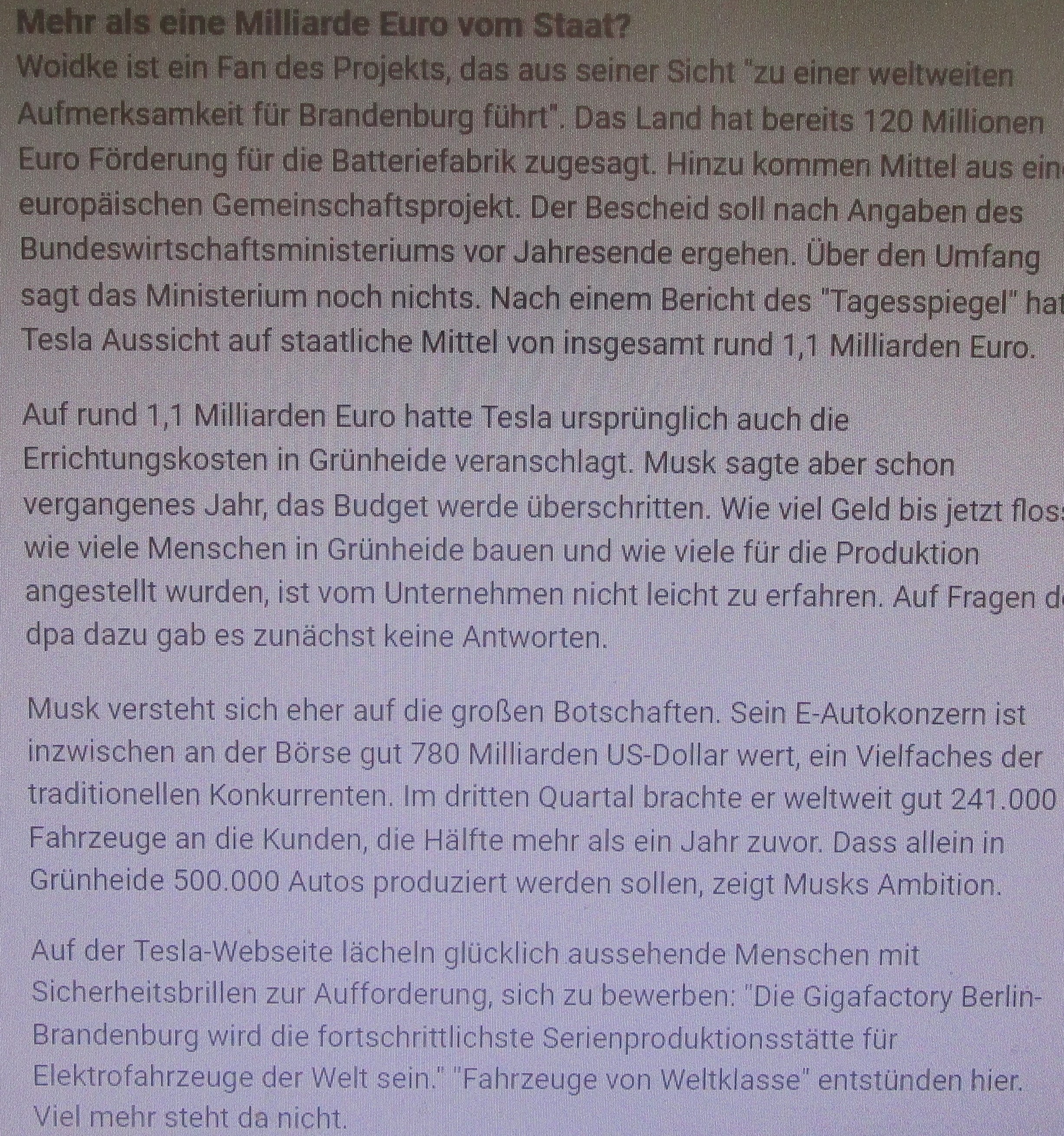 Ausriß MDR. „Bundes- und Landespolitiker lobten die Ansiedlung als wichtiges Signal im Kampf gegen den Klimawandel sowie für den Standort Ostdeutschland.“ „Die Dauer der Fertigstellung lobte Bundeswirtschaftsminister Robert Habeck (Grüne) bei der Eröffnung: „Diese kurze Zeit des Fabrikbaus kann natürlich ein bisschen auch eine Maßgabe sein für Tesla-Tempo auch in anderen Bereichen.“ Habeck nannte Musks Vorgehen „eine andere Unternehmens-Wagemut-Kultur“. Habeck sagte außerdem, er freue sich, dass mit der E-Auto-Fabrik die Abkehr vom Öl neuen Schub bekomme.“