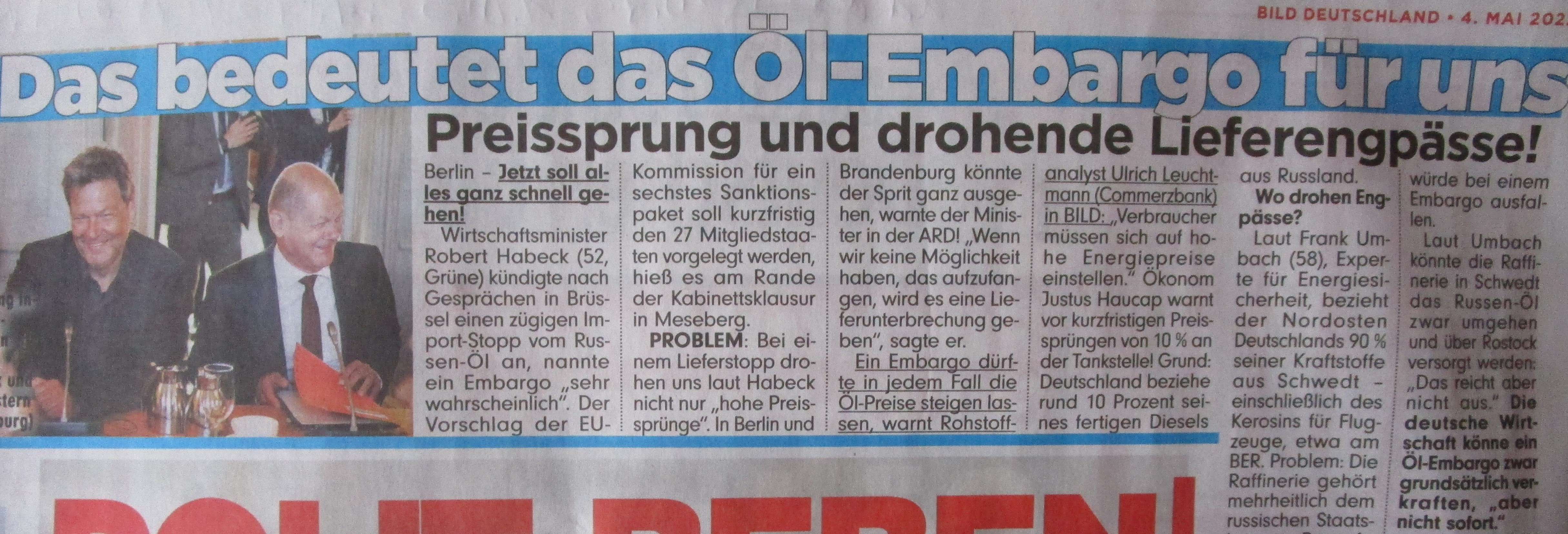Ausriß BILD: “Das bedeutet das Öl-Embargo für uns. Preissprung und drohende Lieferengpässe!”