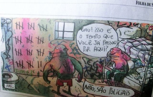 “Ist das die Zeit, die du hier schon abgesessen hast?” “Nein, das sind Polizisten…” Ausriß, Karikatur der größten Qualitätszeitung “Folha de Sao Paulo” zur Serie von Attentaten 2012 auf Polizeibeamte in Sao Paulo – bisher rund 100 Getötete. Wie es heißt, wird die Ermordung auch aus Gefängnissen befohlen, in denen Führer des organisierten Verbrechens inhaftiert sind.